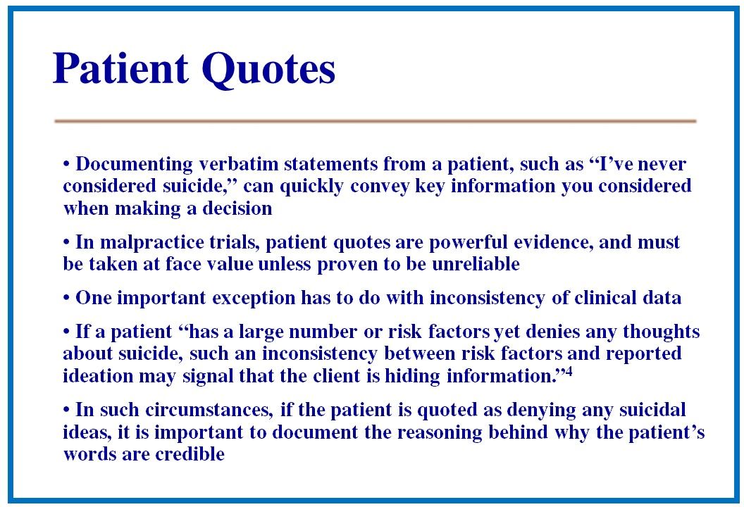• Documenting verbatim statements from a patient, such as "I've never considered suicide," tin can speedily convey key data y'all considered when making a decision