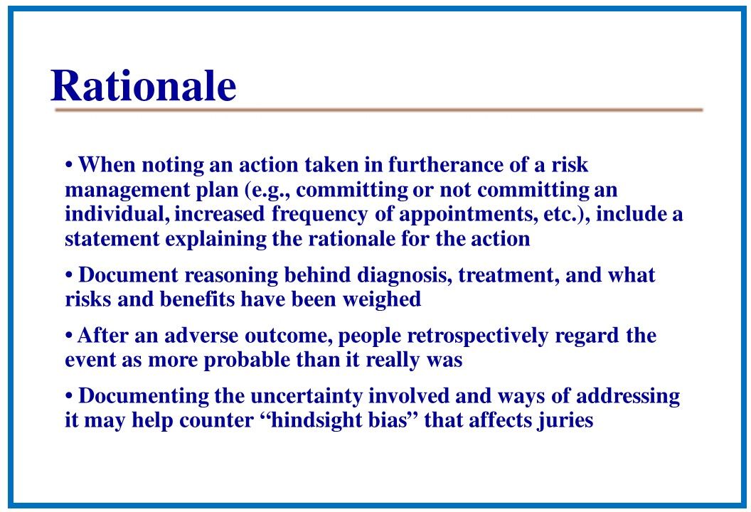 • When noting an action taken in furtherance of a risk management program (eg, committing or not committing an individual, increased frequency of appointments, etc.), include a statement explaining the rationale for the action