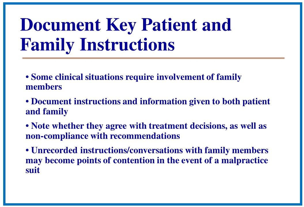 • Unrecorded instructions/conversations with family members may become points of contention in the event of a malpractice accommodate